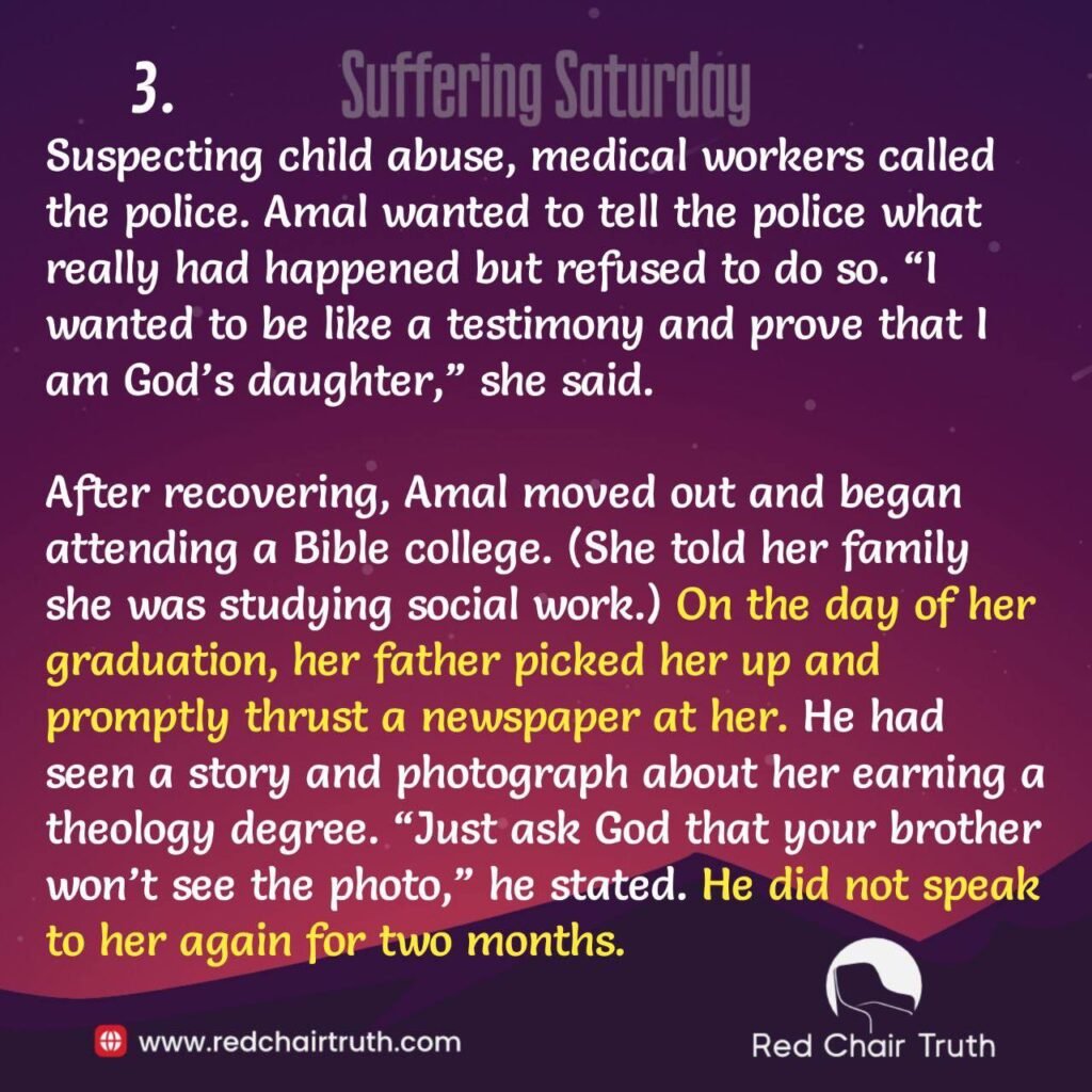 After recovering, Amal moved out and attended a Bible college, telling her family she was studying social work. On her graduation day, her father picked her up and thrust a newspaper at her, having seen a story and photograph of her earning a theology degree. “Just ask God that your brother won’t see the photo,” he stated. He did not speak to her for two months.