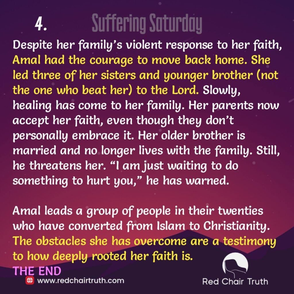 Amal now leads a group of people in their twenties who have converted from Islam to Christianity. The obstacles she has overcome testify to the depth and strength of her faith.
