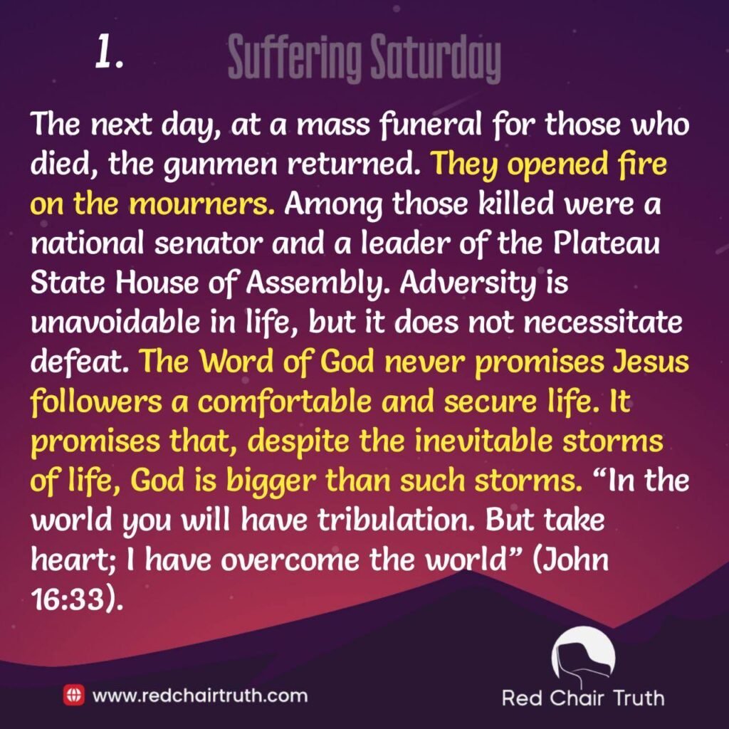 The next day, at a mass funeral for those who died, the gunmen returned. They opened fire on the mourners. Among those killed were a national senator and a leader of the Plateau State House of Assembly. Adversity is unavoidable in life, but it does not necessitate defeat. The Word of God never promises Jesus followers a comfortable and secure life. It promises that, despite the inevitable storms of life, God is bigger than such storms. “In the world you will have tribulation. But take heart; I have overcome the world” (John 16:33).