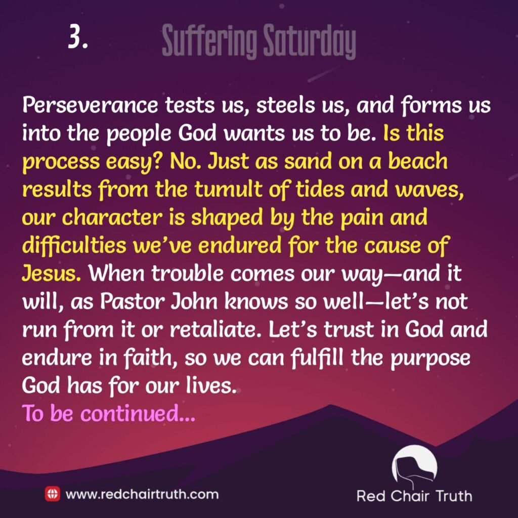 Perseverance tests us, steels us, and forms us into the people God wants us to be. Is this process easy? No. Just as sand on a beach results from the tumult of tides and waves, our character is shaped by the pain and difficulties we’ve endured for the cause of Jesus. When trouble comes our way-and it will, as Pastor John knows so well-let’s not run from it or retaliate. Let’s trust in God and endure in faith, so we can fulfill the purpose God has for our lives.