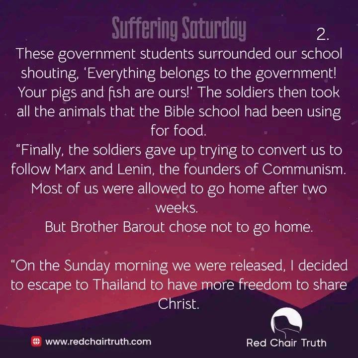 “Finally, the soldiers gave up trying to convert us to follow Marx and Lenin, the founders of Communism. Most of us were allowed to go home after two weeks. But Brother Barout chose not to go home.