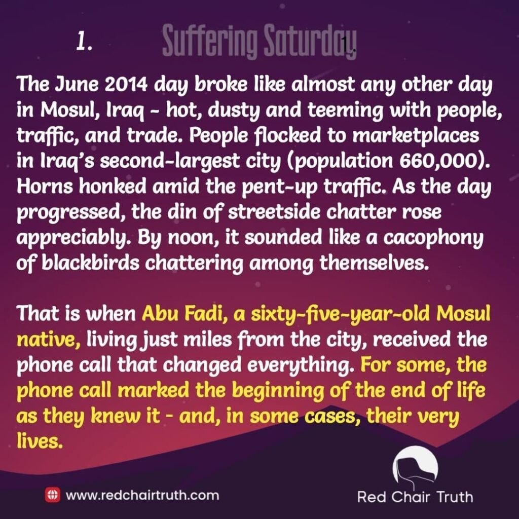 The June 2014 day broke like almost any other day in Mosul, Iraq – hot, dusty and teeming with people, traffic, and trade. People flocked to marketplaces in Iraq’s second-largest city (population 660,000). Horns honked amid the pent-up traffic. As the day progressed, the din of streetside chatter rose appreciably. By noon, it sounded like a cacophony of blackbirds chattering among themselves. That is when Abu Fadi, a sixty-five-year-old Mosul native, living just miles from the city, received the phone call that changed everything. For some, the phone call marked the beginning of the end of life as they knew it – and, in some cases, their very lives.