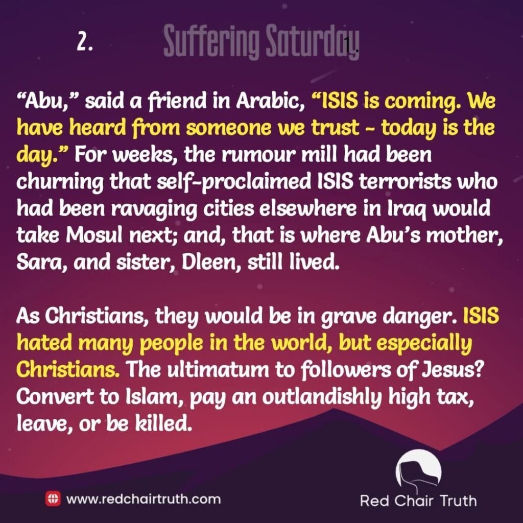 “Abu,” said a friend in Arabic, “ISIS is coming. We have heard from someone we trust – today is the day.” For weeks, the rumour mill had been churning that self-proclaimed ISIS terrorists who had been ravaging cities elsewhere in Iraq would take Mosul next; and, that is where Abu’s mother, Sara, and sister, Dleen, still lived. As Christians, they would be in grave danger. ISIS hated many people in the world, but especially Christians. The ultimatum to followers of Jesus? Convert to Islam, pay an outlandishly high tax, leave, or be killed.