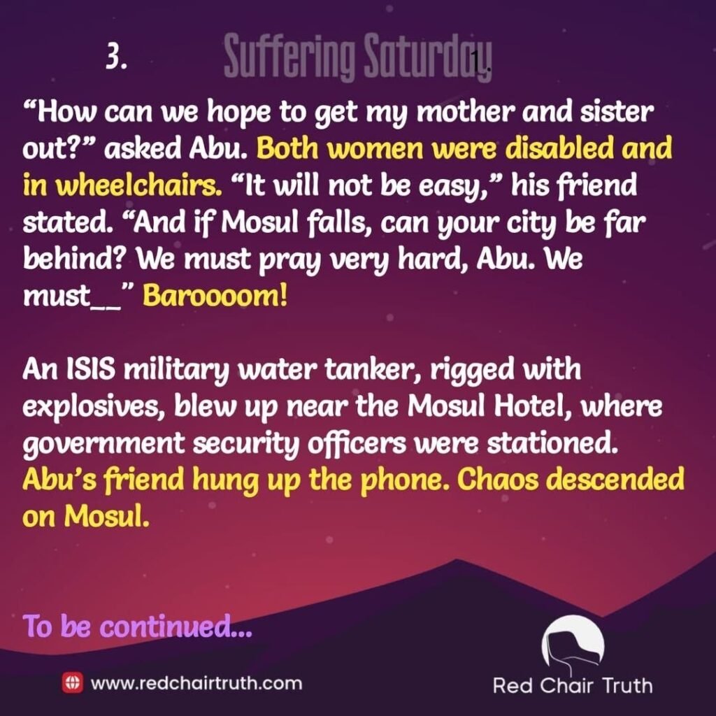 “How can we hope to get my mother and sister out?” asked Abu. Both women were disabled and in wheelchairs. “It will not be easy,” his friend stated. “And if Mosul falls, can your city be far behind? We must pray very hard, Abu. We must__” Baroooom An ISIS military water tanker, rigged with explosives, blew up near the Mosul Hotel, where government security officers were stationed. Abu’s friend hung up the phone. Chaos descended on Mosul.