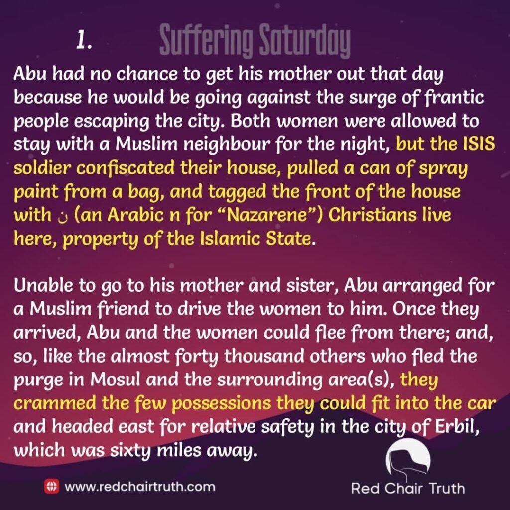 Abu had no chance to get his mother out that day because he would be going against the surge of frantic people escaping the city. Both women were allowed to stay with a Muslim neighbour for the night, but the ISIS soldier confiscated their house, pulled a can of spray paint from a bag, and tagged the front of the house with an Arabic n for “Nazarene”) Christians live here, property of the Islamic State. Unable to go to his mother and sister, Abu arranged for a Muslim friend to drive the women to him. Once they arrived, Abu and the women could flee from there; and, so, like the almost forty thousand others who fled the purge in Mosul and the surrounding area(s), they crammed the few possessions they could fit into the car and headed east for relative safety in the city of Erbil, which was sixty miles away.