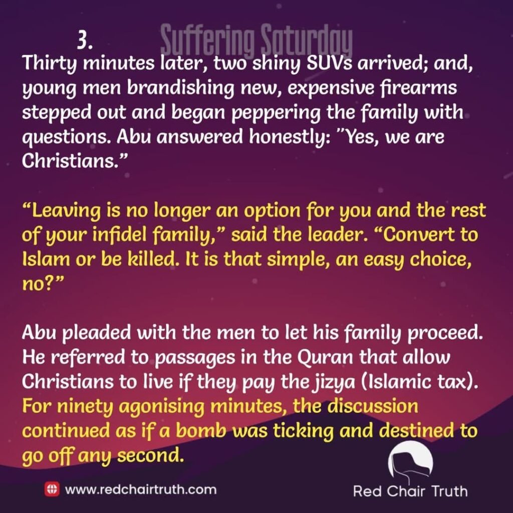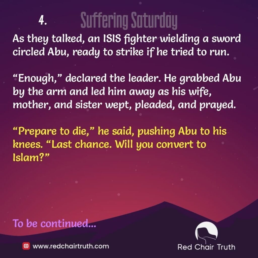 Thirty minutes later, two shiny SUVs arrived; and, young men brandishing new, expensive firearms stepped out and began peppering the family with questions. Abu answered honestly: “Yes, we are Christians. “Leaving is no longer an option for you and the rest of your infidel family, “said the leader. “Convert to Islam or be killed. It is that simple, an easy choice, no? “Abu pleaded with the men to let his family proceed. He referred to passages in the Quran that allow Christians to live if they pay the jizya (Islamic tax). For ninety agonizing minutes, the discussion continued as if a bomb was ticking and destined to go off any second. As they talked, an ISIS fighter wielding a sword circled Abu, ready to strike if he tried to run. “Enough, “declared the leader. He grabbed Abu by the arm and led him away as his wife, mother, and sister wept, pleaded, and prayed. “Prepare to die,” he said, pushing Abu to his knees. “Last chance. Will you convert to Islam?”