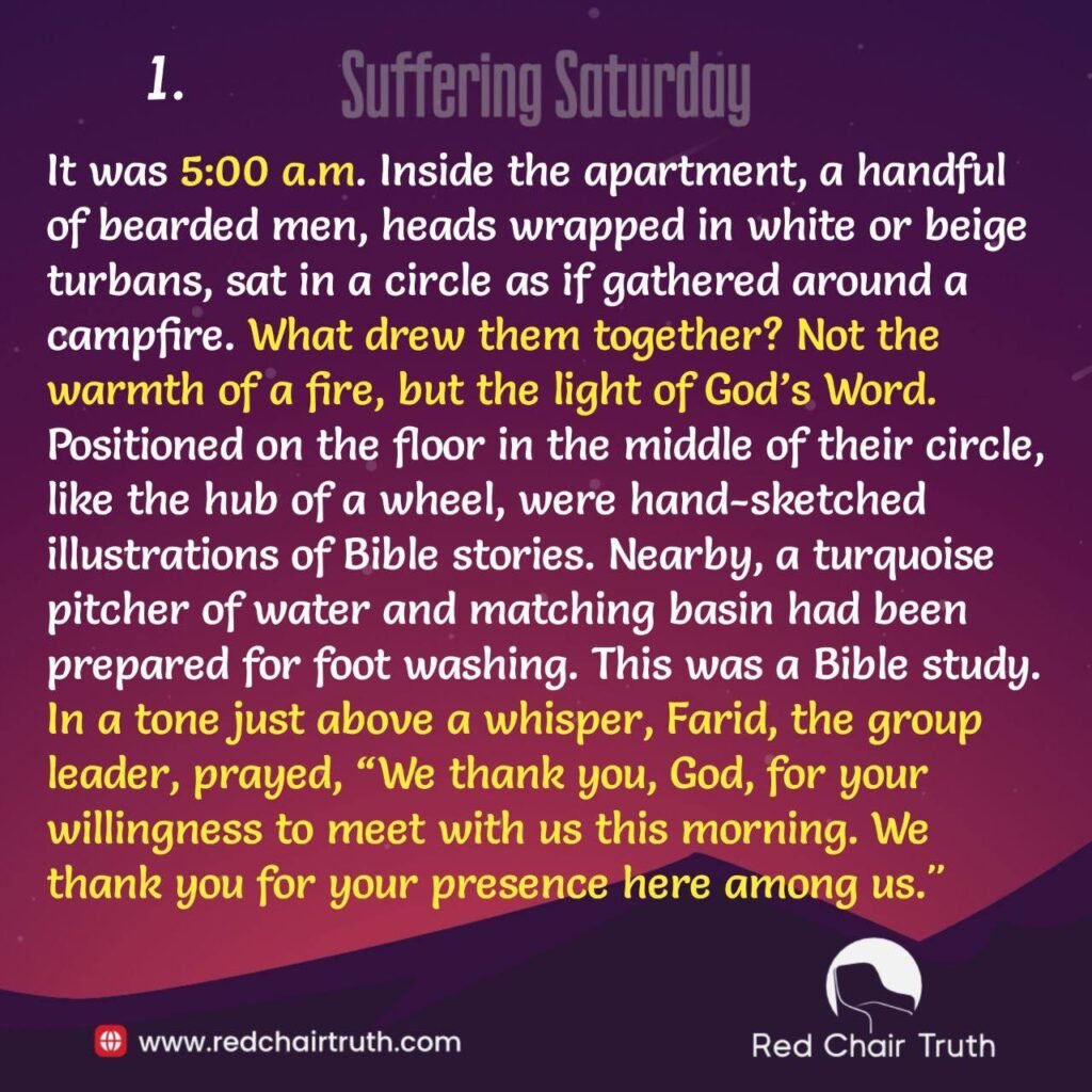 It was 5:00 a.m. Inside the apartment, a handful of bearded men, heads wrapped in white or beige turbans, sat in a circle as if gathered around a campfire. What drew them together? Not the warmth of a fire, but the light of God’s Word. Positioned on the floor in the middle of their circle, like the hub of a wheel, were hand-sketched illustrations of Bible stories. Nearby, a turquoise pitcher of water and matching basin had been prepared for foot washing. This was a Bible study. In a tone just above a whisper, Farid, the group leader, prayed, “We thank you, God, for your willingness to meet with us this morning. We thank you for your presence here among us.”