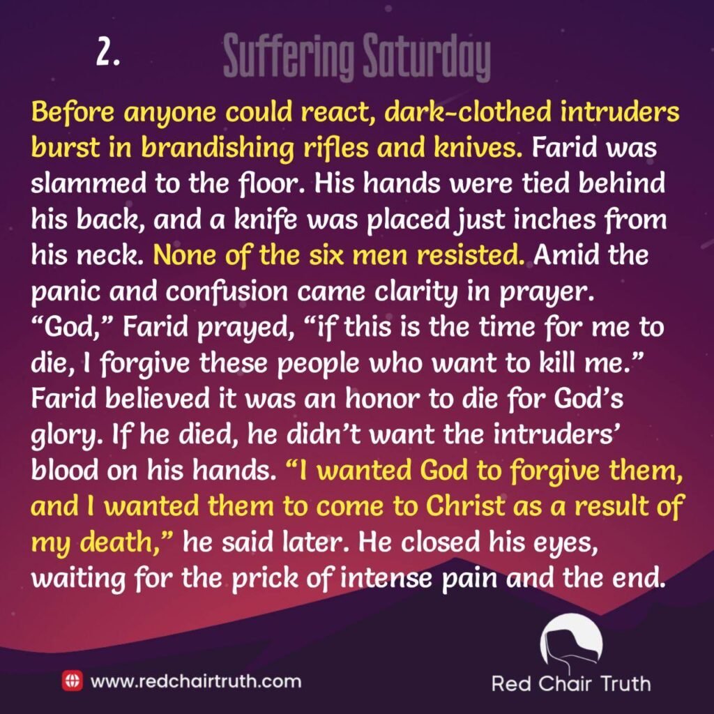 Before anyone could react, dark-clothed intruders burst in brandishing rifles and knives. Farid was slammed to the floor. His hands were tied behind his back, and a knife was placed just inches from his neck. None of the six men resisted. Amid the panic and confusion came clarity in prayer. “God,” Farid prayed, “if this is the time for me to die, I forgive these people who want to kill me.” Farid believed it was an honor to die for God’s glory. If he died, he didn’t want the intruders’ blood on his hands. “I wanted God to forgive them, and I wanted them to come to Christ as a result of my death,” he said later. He closed his eyes, waiting for the prick of intense pain and the end.