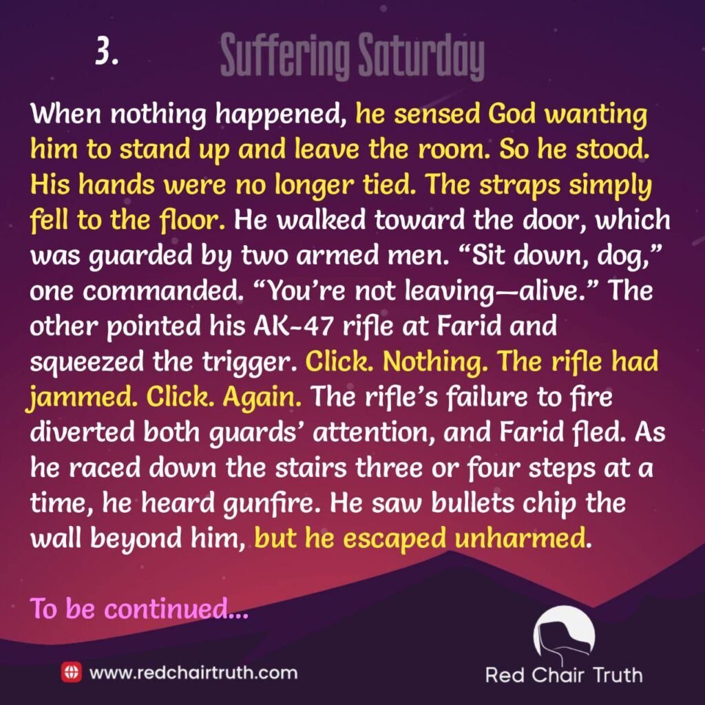 When nothing happened, he sensed God wanting him to stand up and leave the room. So he stood. His hands were no longer tied. The straps simply fell to the floor. He walked toward the door, which was guarded by two armed men. “Sit down, dog,” one commanded. “You’re not leaving—alive.” The other pointed his AK-47 rifle at Farid and squeezed the trigger. Click. Nothing. The rifle had jammed. Click. Again. The rifle’s failure to fire diverted both guards’ attention, and Farid fled. As he raced down the stairs three or four steps at a time, he heard gunfire. He saw bullets chip the wall beyond him, but he escaped unharmed.