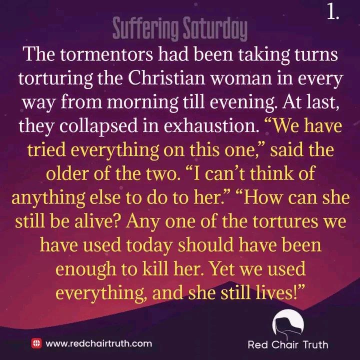 The tormentors had been taking turns torturing the Christian woman in every way from morning till evening. At last, they collapsed in exhaustion. “We have tried everything on this one,” said the older of the two. “I can’t think of anything else to do to her.” “How can she still be alive? Any one of the tortures we have used today should have been enough to kill her. Yet we used everything, and she still lives!”
