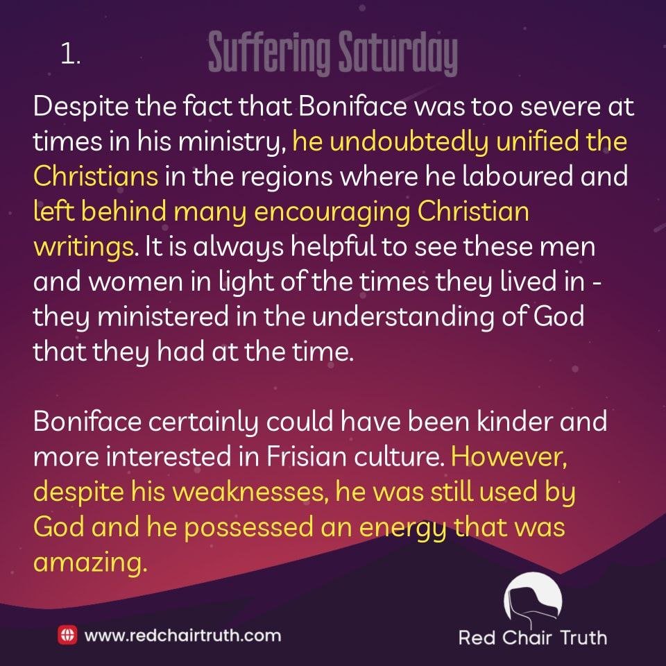 Despite the fact that Boniface was too severe at times in his ministry, he undoubtedly unified the Christians in the regions where he laboured and left behind many encouraging Christian writings. It is always helpful to see these men and women in light of the times they lived in they ministered in the understanding of God that they had at the time. – Boniface certainly could have been kinder and more interested in Frisian culture. However, despite his weaknesses, he was still used by God and he possessed an energy that was amazing.