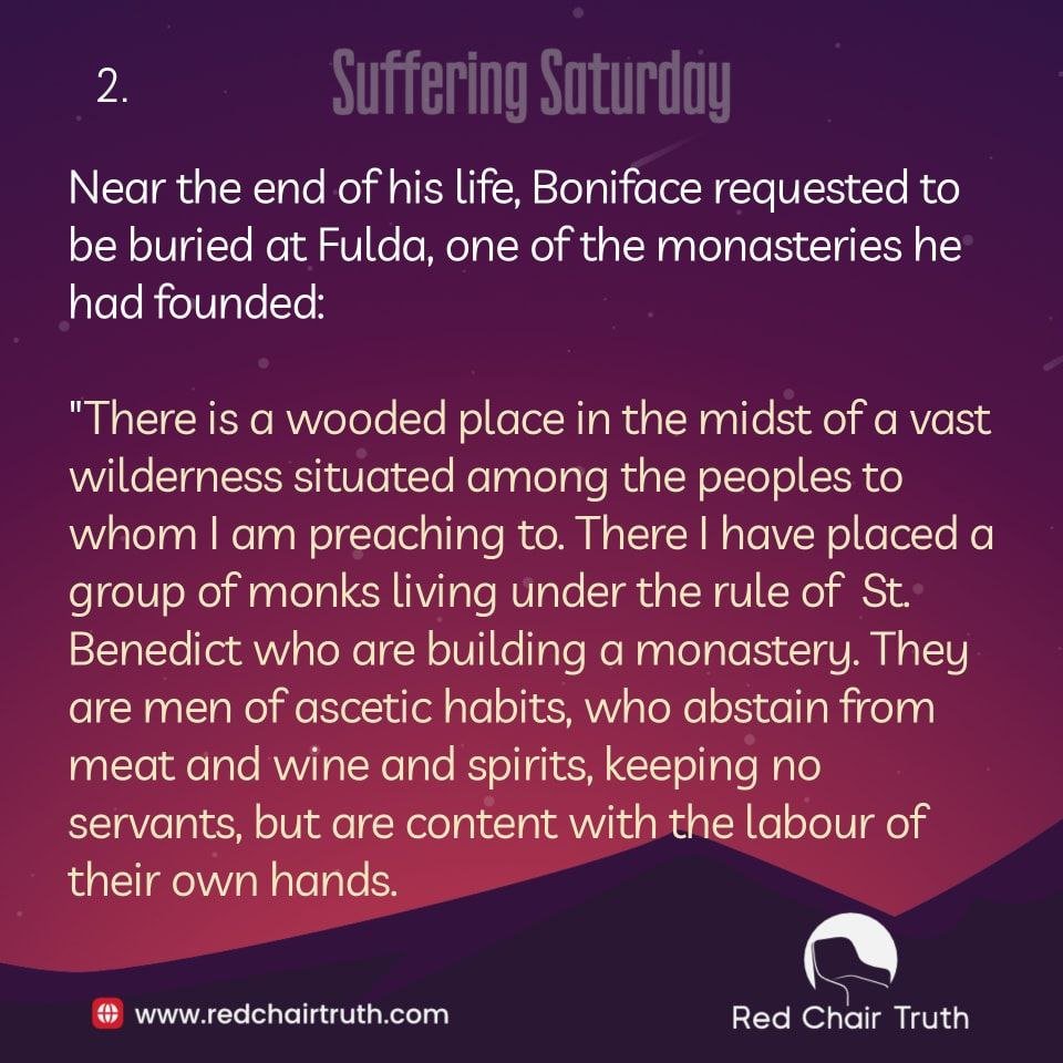 Near the end of his life, Boniface requested to be buried at Fulda, one of the monasteries he had founded: “There is a wooded place in the midst of a vast wilderness situated among the peoples to whom I am preaching to. There I have placed a group of monks living under the rule of St. Benedict who are building a monastery. They are men of ascetic habits, who abstain from meat and wine and spirits, keeping no servants, but are content with the labour of their own hands.