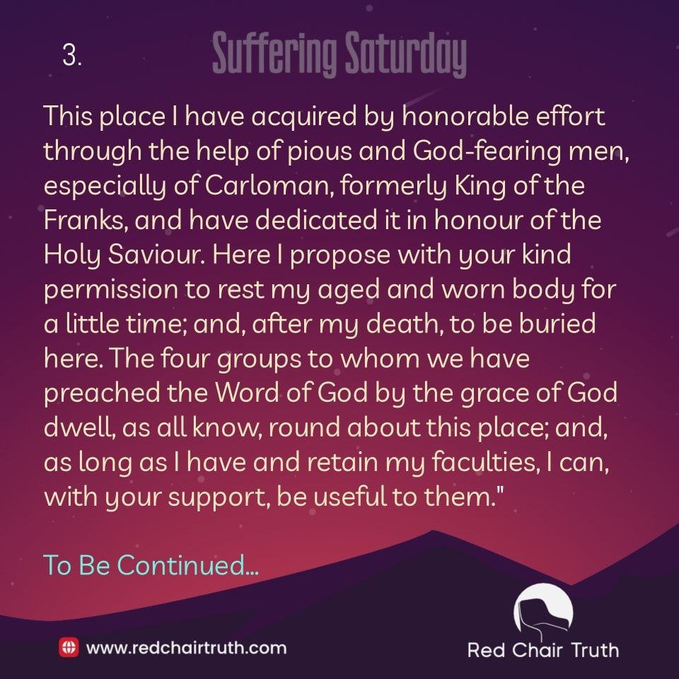 This place I have acquired by honorable effort through the help of pious and God-fearing men, especially of Carloman, formerly King of the Franks, and have dedicated it in honour of the Holy Saviour. Here I propose with your kind permission to rest my aged and worn body for a little time; and, after my death, to be buried here. The four groups to whom we have preached the Word of God by the grace of God dwell, as all know, round about this place; and, as long as I have and retain my faculties, I can, with your support, be useful to them.”