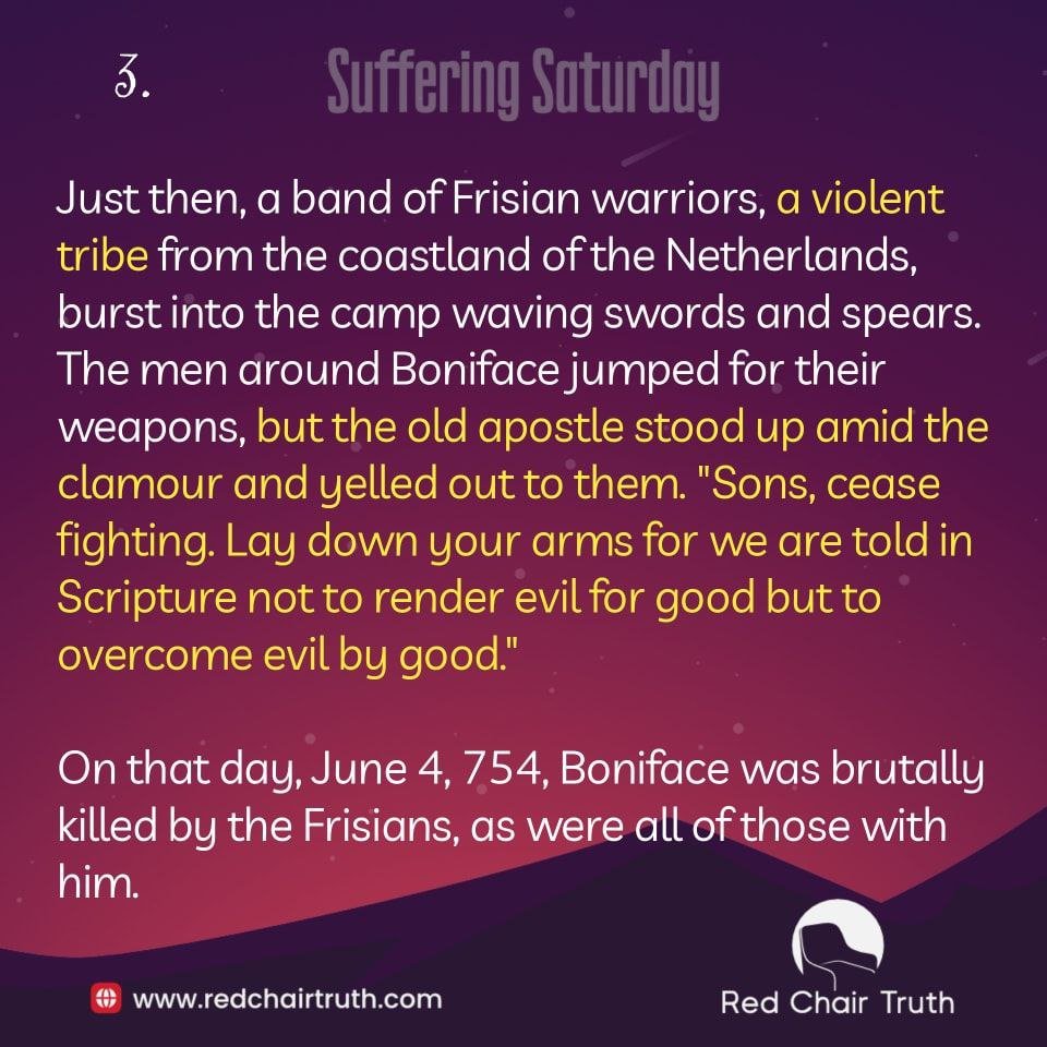 Just then, a band of Frisian warriors, a violent tribe from the coastland of the Netherlands, burst into the camp waving swords and spears. The men around Boniface jumped for their weapons, but the old apostle stood up amid the clamour and yelled out to them. “Sons, cease fighting. Lay down your arms for we are told in Scripture not to render evil for good but to overcome evil by good.” On that day, June 4, 754, Boniface was brutally killed by the Frisians, as were all of those with him.