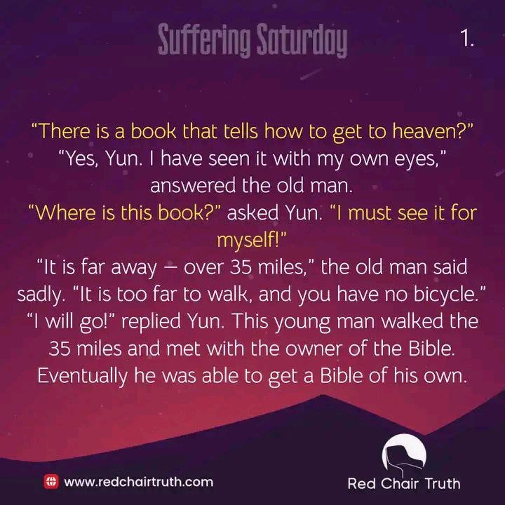 “I will go!” replied Yun. This young man walked the 35 miles and met with the owner of the Bible. Eventually he was able to get a Bible of his own.
