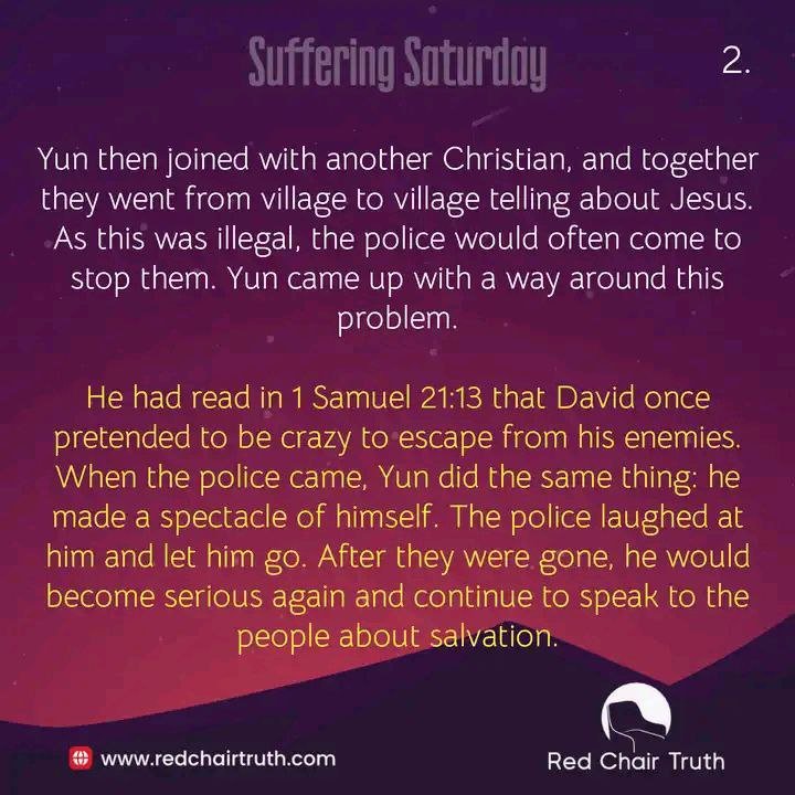 He had read in 1 Samuel 21:13 that David once pretended to be crazy to escape from his enemies. When the police came, Yun did the same thing: he made a spectacle of himself. The police laughed at him and let him go. After they were gone, he would become serious again and continue to speak to the people about salvation.
