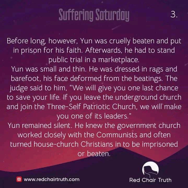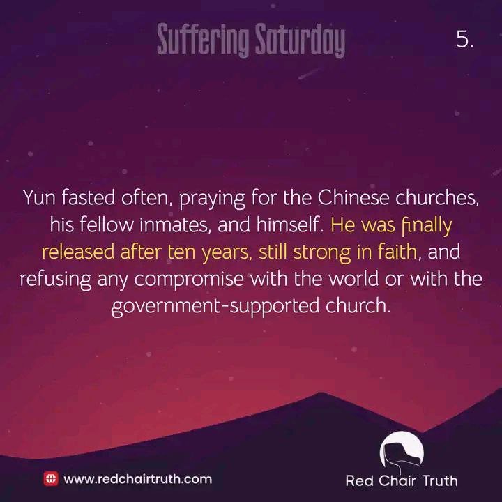 Yun fasted often, praying for the Chinese churches, his fellow inmates, and himself. He was finally released after ten years, still strong in faith, and refusing any compromise with the world or with the government-supported church.