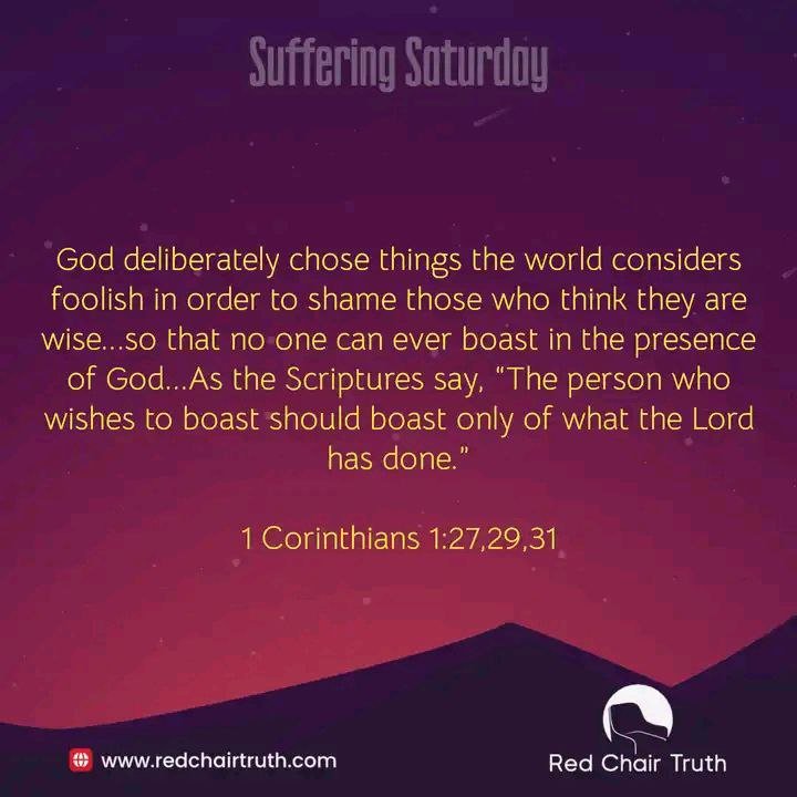 God deliberately chose things the world considers foolish in order to shame those who think they are wise…so that no one can ever boast in the presence of God… As the Scriptures say, “The person who wishes to boast should boast only of what the Lord has done.” 1 Corinthians 1:27, 29, 31.