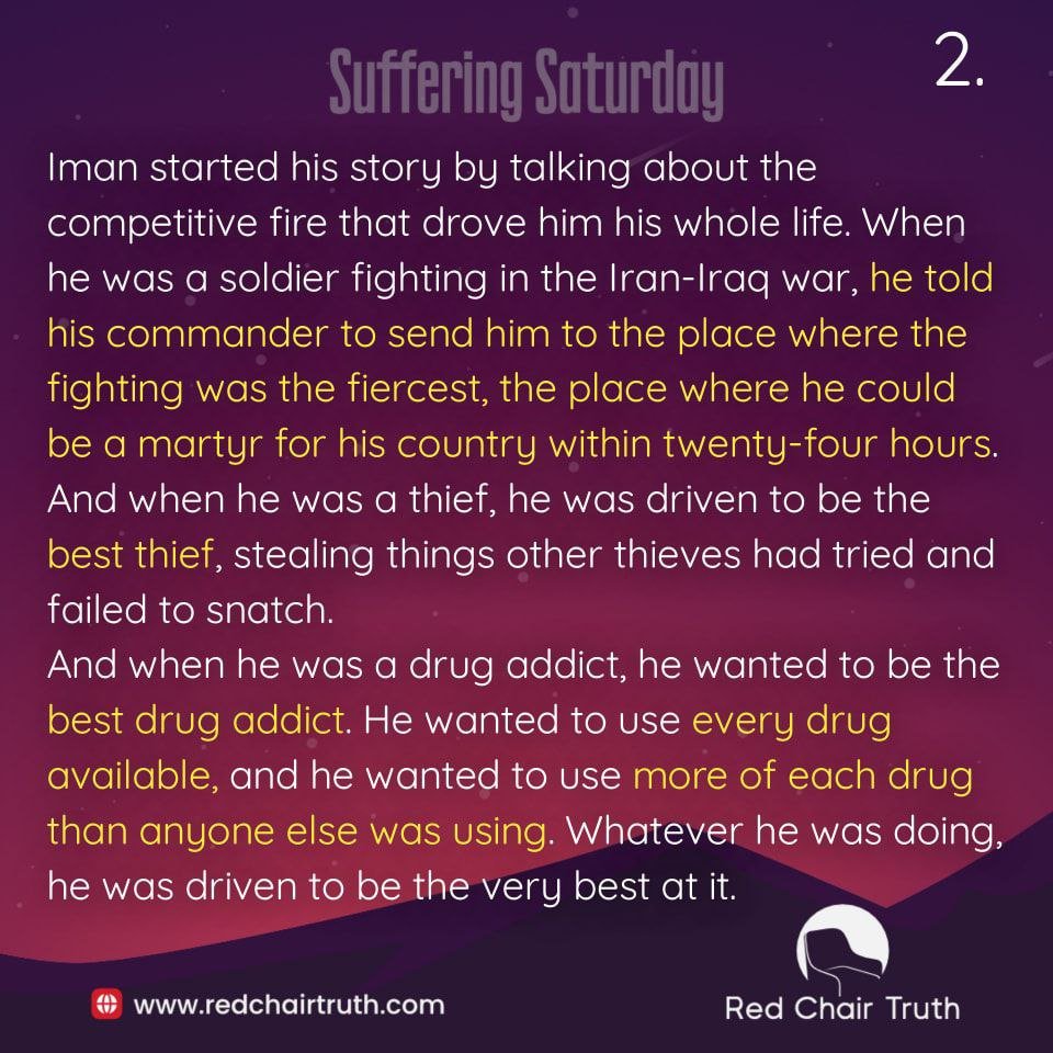 Iman started his story by talking about the competitive fire that drove him his whole life. When he was a soldier fighting in the Iran-Iraq war, he told his commander to send him to the place where the fighting was the fiercest, the place where he could be a martyr for his country within twenty-four hours.