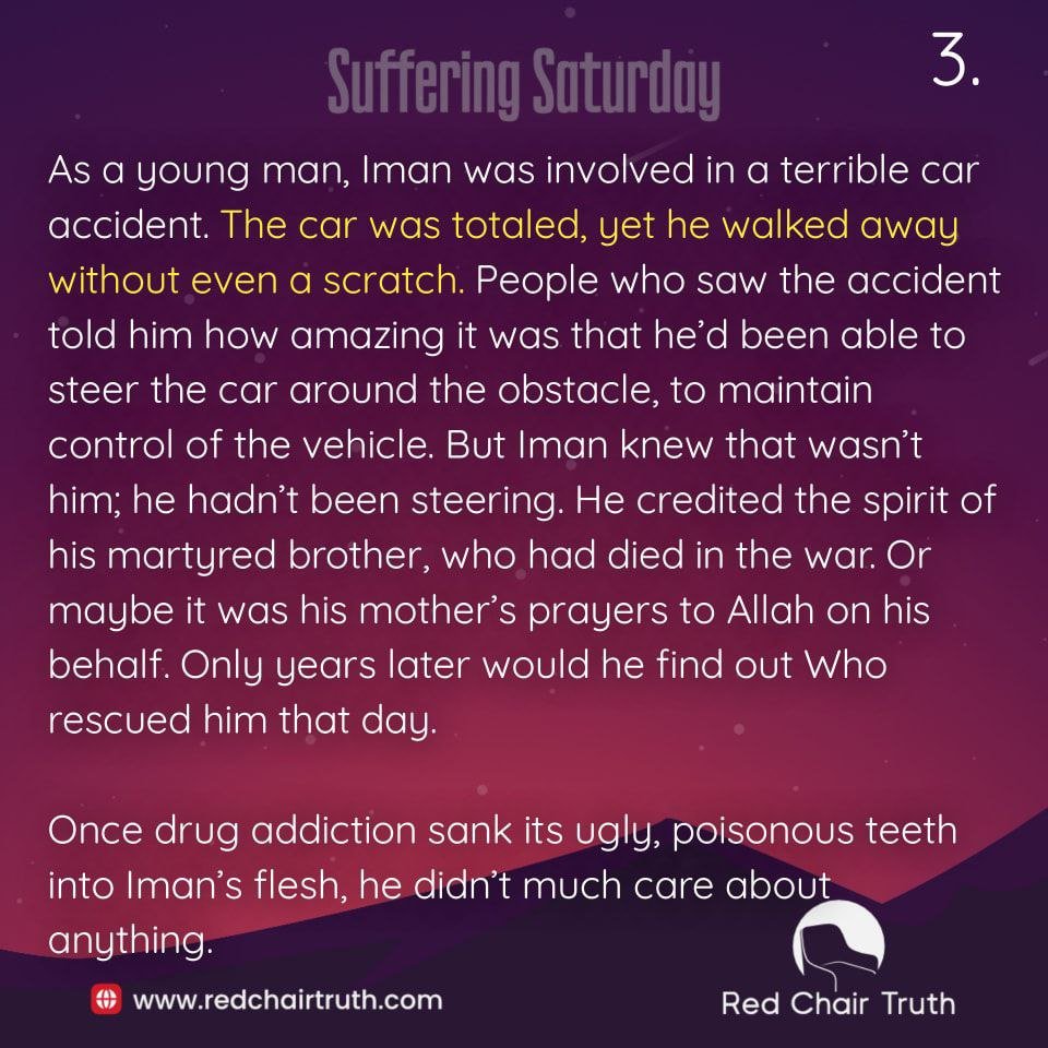 As a young man, Iman was involved in a terrible car accident. The car was totaled, yet he walked away without even a scratch. People who saw the accident told him how amazing it was that he’d been able to steer the car around the obstacle, to maintain control of the vehicle. But Iman knew that wasn’t him; he hadn’t been steering. He credited the spirit of his martyred brother, who had died in the war. Or maybe it was his mother’s prayers to Allah on his behalf. Only years later would he find out Who rescued him that day.