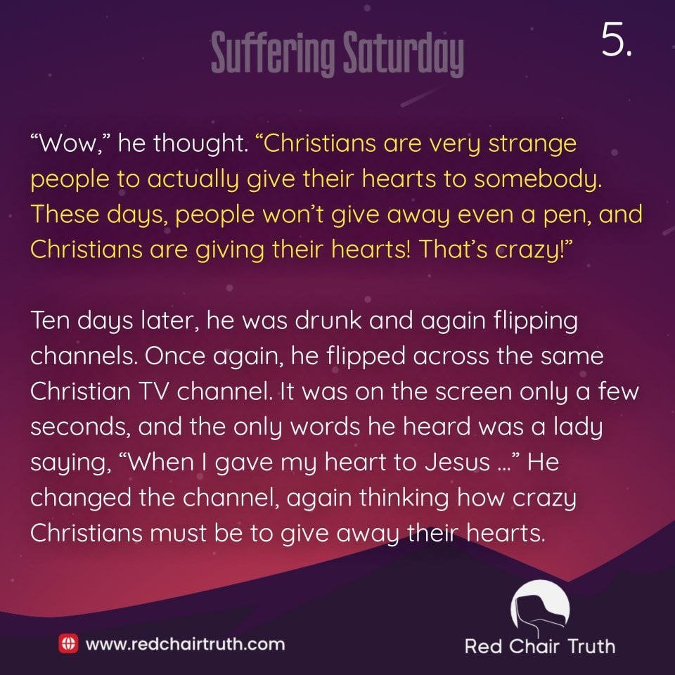 Ten days later, he was drunk and again flipping channels. Once again, he flipped across the same Christian TV channel. It was on the screen only a few seconds, and the only words he heard was a lady saying, “When I gave my heart to Jesus …” He changed the channel, again thinking how crazy Christians must be to give away their hearts.