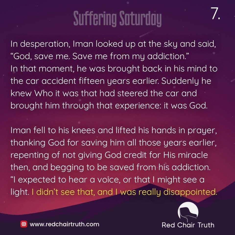 In that moment, he was brought back in his mind to the car accident fifteen years earlier. Suddenly he knew Who it was that had steered the car and brought him through that experience: it was God. Iman fell to his knees and lifted his hands in prayer, thanking God for saving him all those years earlier, repenting of not giving God credit for His miracle then, and begging to be saved from his addiction.
