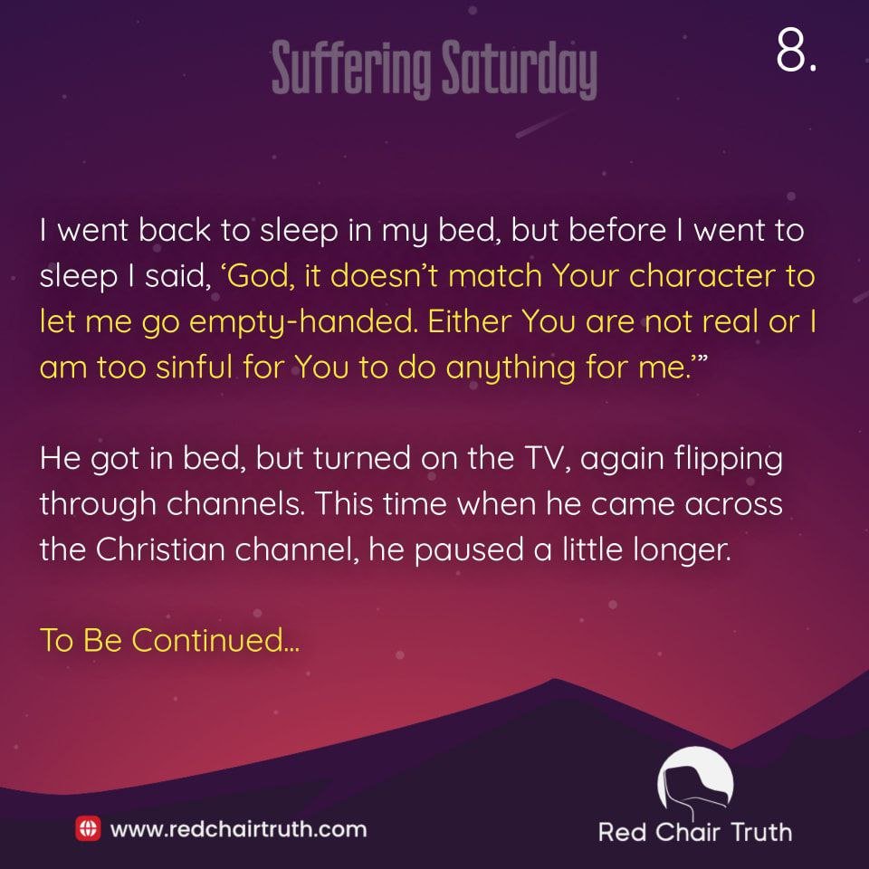 “I expected to hear a voice, or that I might see a light. I didn’t see that, and I was really disappointed. I went back to sleep in my bed, but before I went to sleep I said, ‘God, it doesn’t match Your character to let me go empty-handed. Either You are not real or I am too sinful for You to do anything for me.” He got in bed, but turned on the TV, again flipping through channels. This time when he came across the Christian channel, he paused a little longer.