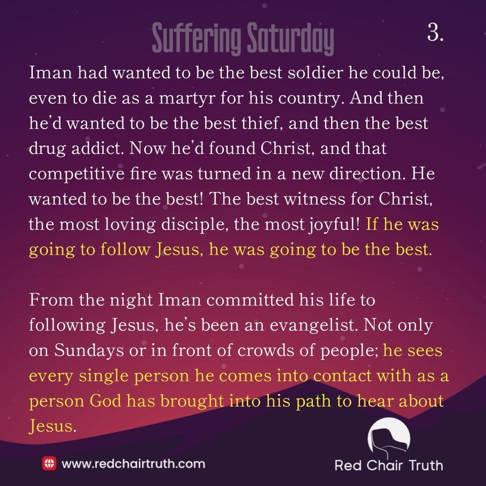 Iman had wanted to be the best soldier he could be, even to die as a martyr for his country. And then he’d wanted to be the best thief, and then the best drug addict. Now he’d found Christ, and that competitive fire was turned in a new direction. He wanted to be the best! The best witness for Christ, the most loving disciple, the most joyful! If he was going to follow Jesus, he was going to be the best.