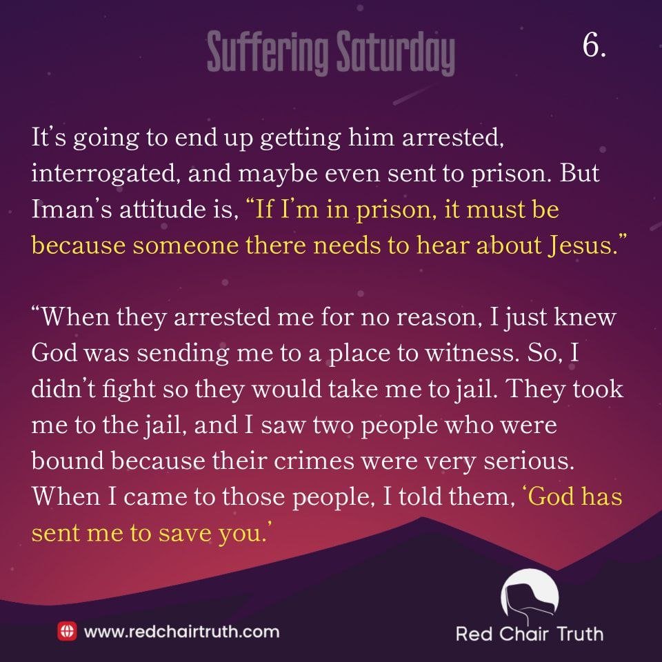 It’s going to end up getting him arrested, interrogated, and maybe even sent to prison. But Iman’s attitude is, “If I’m in prison, it must be because someone there needs to hear about Jesus.”
