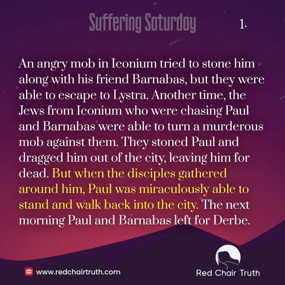 An angry mob in Iconium tried to stone him along with his friend Barnabas, but they were able to escape to Lystra. Another time, the Jews from Iconium who were chasing Paul and Barnabas were able to turn a murderous mob against them. They stoned Paul and dragged him out of the city, leaving him for dead. But when the disciples gathered around him, Paul was miraculously able to stand and walk back into the city. The next morning Paul and Barnabas left for Derbe.