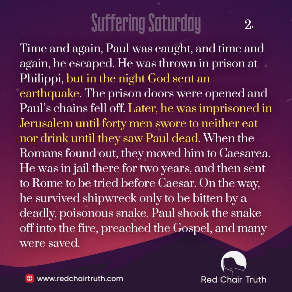Time and again, Paul was caught, and time and again, he escaped. He was thrown in prison at Philippi, but in the night God sent an earthquake. The prison doors were opened and Paul’s chains fell off. Later, he was imprisoned in Jerusalem until forty men swore to neither eat nor drink until they saw Paul dead. When the Romans found out, they moved him to Caesarea. He was in jail there for two years, and then sent to Rome to be tried before Caesar. On the way, he survived shipwreck only to be bitten by a deadly, poisonous snake. Paul shook the snake off into the fire, preached the Gospel, and many were saved.