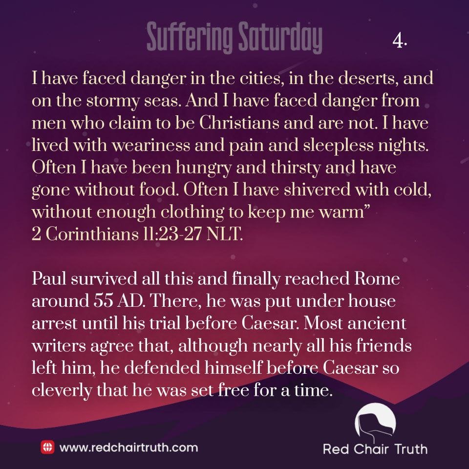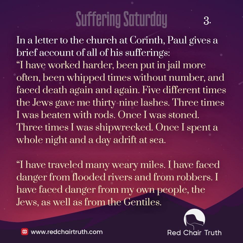 “I have traveled many weary miles. I have faced danger from flooded rivers and from robbers. I have faced danger from my own people, the Jews, as well as from the Gentiles. I have faced danger in the cities, in the deserts, and on the stormy seas. And I have faced danger from men who claim to be Christians and are not. I have lived with weariness and pain and sleepless nights. Often I have been hungry and thirsty and have gone without food. Often I have shivered with cold, without enough clothing to keep me warm” 2 Corinthians 11:23-27 NLT.