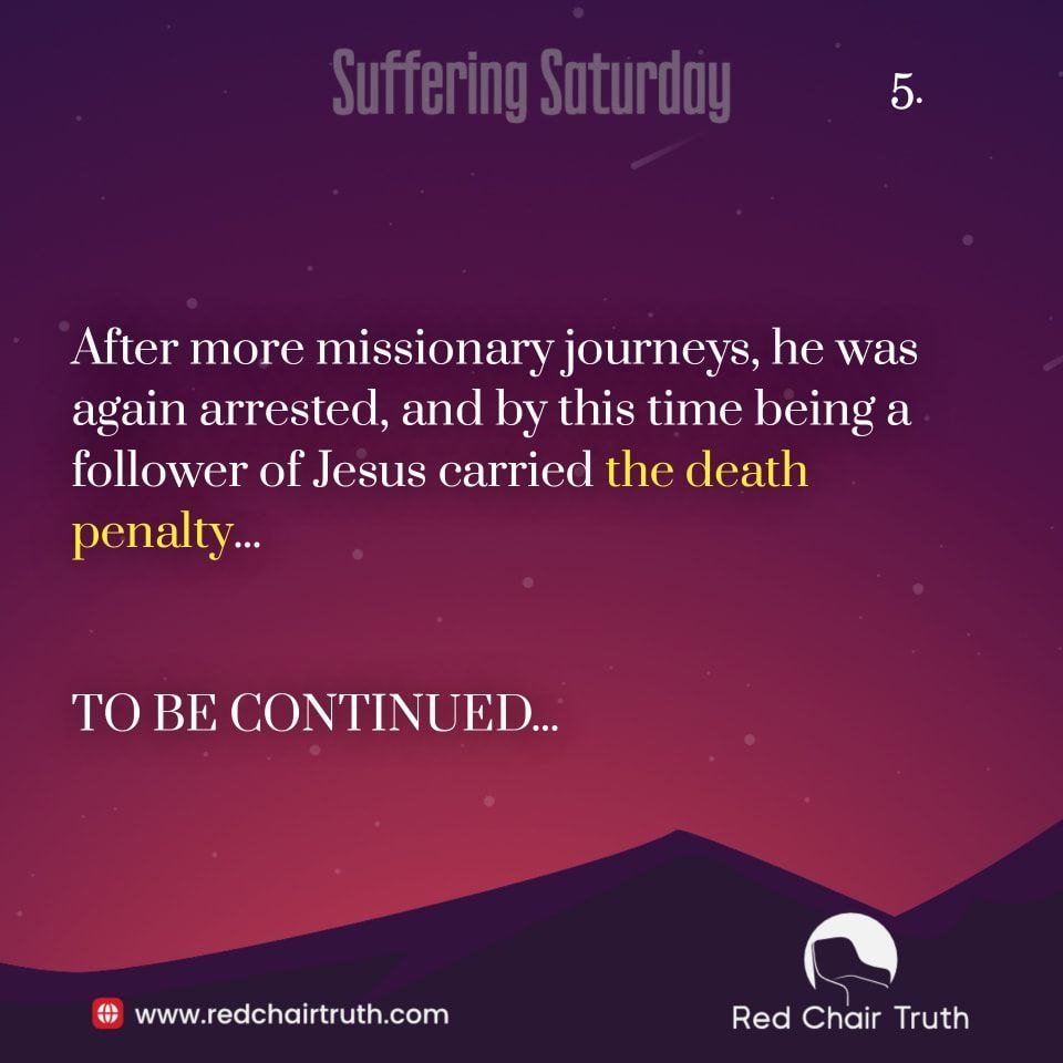 In a letter to the church at Corinth, Paul gives a brief account of all of his sufferings: “I have worked harder, been put in jail more often, been whipped times without number, and faced death again and again. Five different times the Jews gave me thirty-nine lashes. Three times I was beaten with rods. Once I was stoned. Three times I was shipwrecked. Once I spent a whole night and a day adrift at sea.