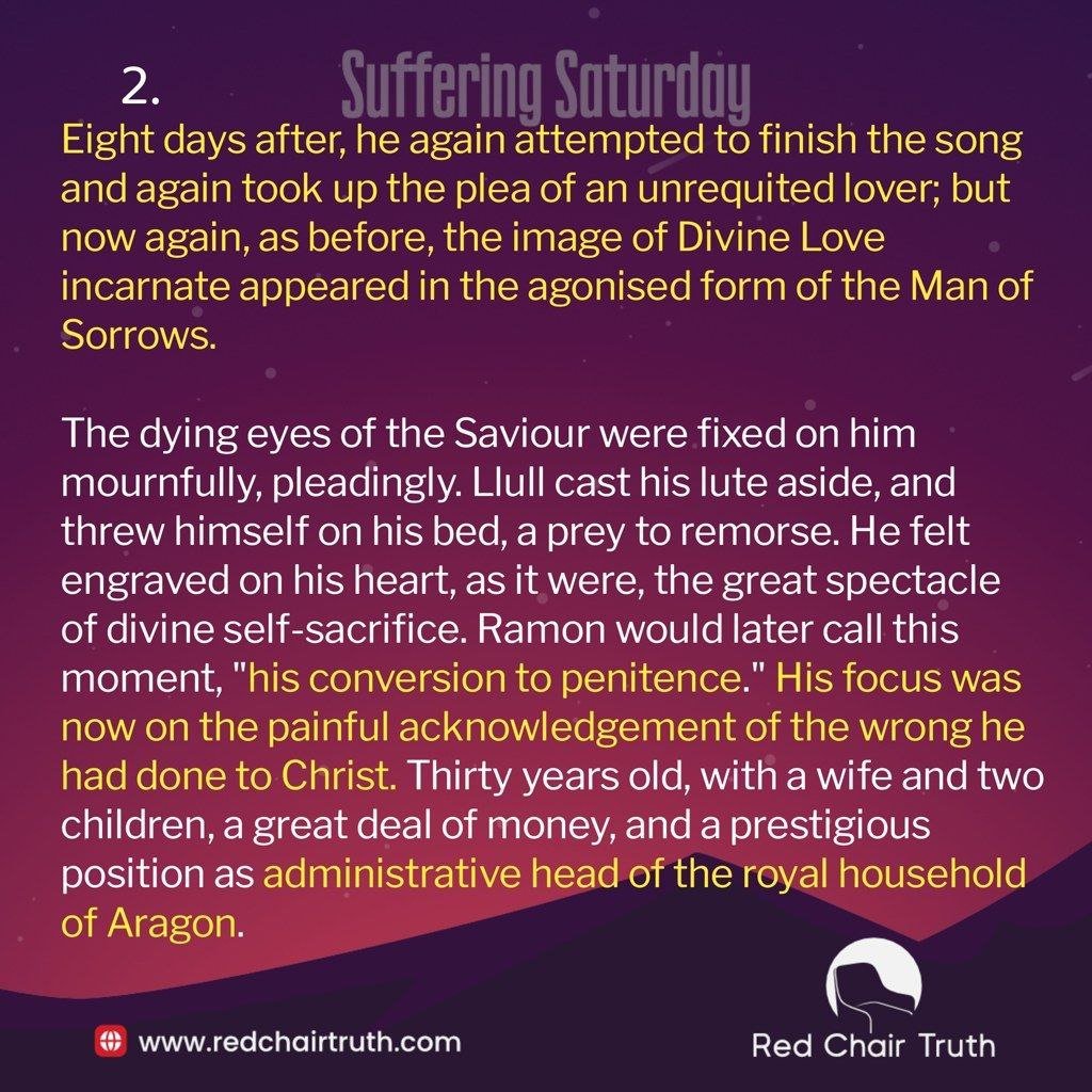 Eight days after, he again attempted to finish the song and again took up the plea of an unrequited lover; but now again, as before, the image of Divine Love incarnate appeared in the agonised form of the Man of Sorrows. The dying eyes of the Saviour were fixed on him mournfully, pleadingly. Llull cast his lute aside, and threw himself on his bed, a prey to remorse. He felt engraved on his heart, as it were, the great spectacle of divine self-sacrifice. Ramon would later call this moment, “his conversion to penitence.” His focus was now on the painful acknowledgement of the wrong he had done to Christ. Thirty years old, with a wife and two children, a great deal of money, and a prestigious position as administrative head of the royal household of Aragon.