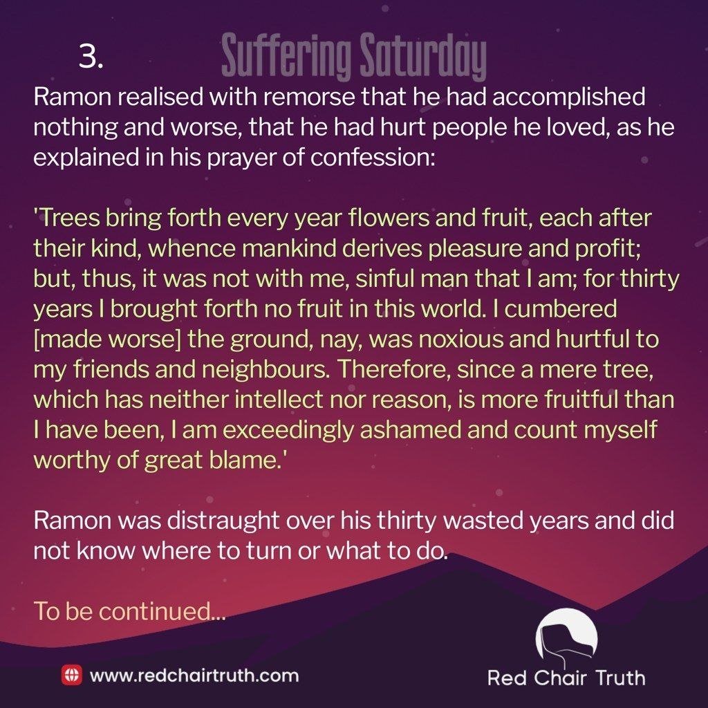 Ramon realised with remorse that he had accomplished nothing and worse, that he had hurt people he loved, as he explained in his prayer of confession: ‘Trees bring forth every year flowers and fruit, each after their kind, whence mankind derives pleasure and profit; but, thus, it was not with me, sinful man that I am; for thirty years I brought forth no fruit in this world. I cumbered [made worse] the ground, nay, was noxious and hurtful to my friends and neighbours. Therefore, since a mere tree, which has neither intellect nor reason, is more fruitful than I have been, I am exceedingly ashamed and count myself worthy of great blame.’ Ramon was distraught over his thirty wasted years and did not know where to turn or what to do.