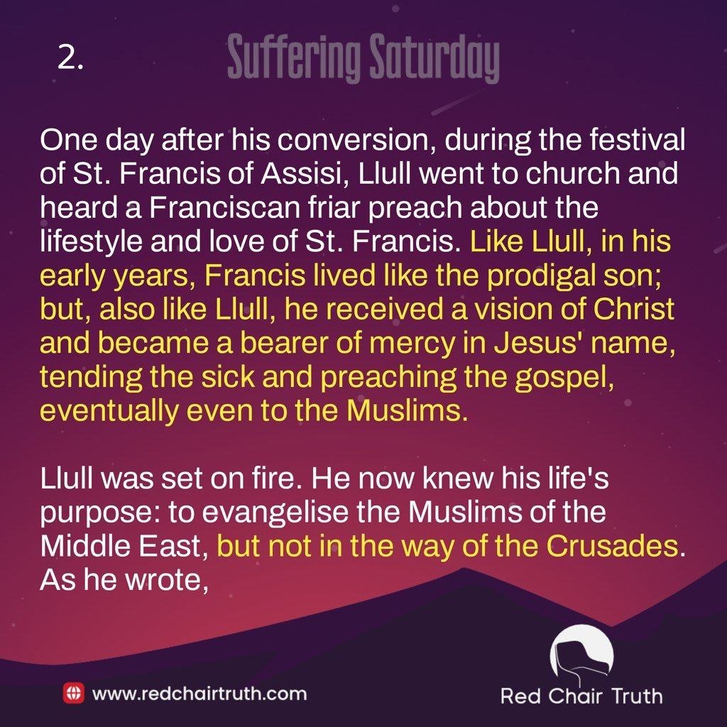 One day after his conversion, during the festival of St. Francis of Assisi, Llull went to church and heard a Franciscan friar preach about the lifestyle and love of St. Francis. Like Llull, in his early years, Francis lived like the prodigal son; but, also like Llull, he received a vision of Christ and became a bearer of mercy in Jesus’ name, tending the sick and preaching the gospel, eventually even to the Muslims.
