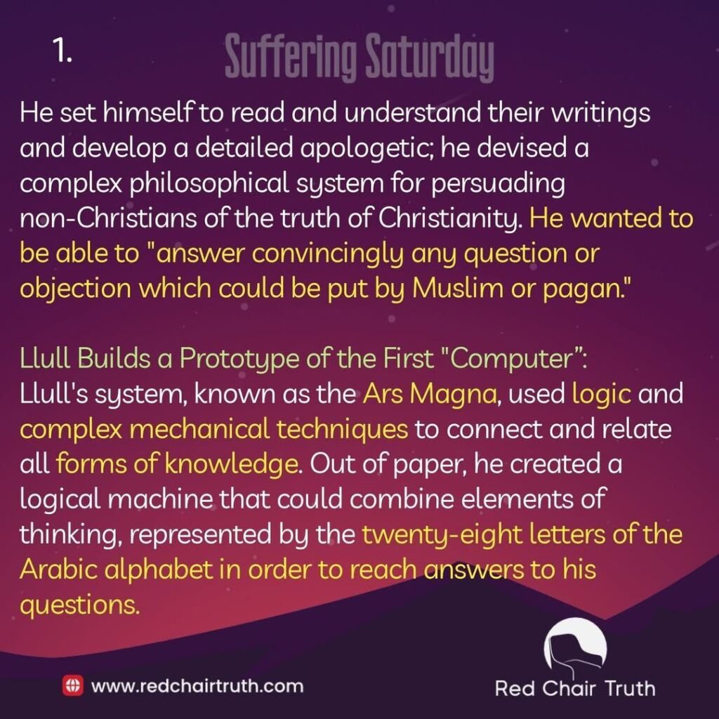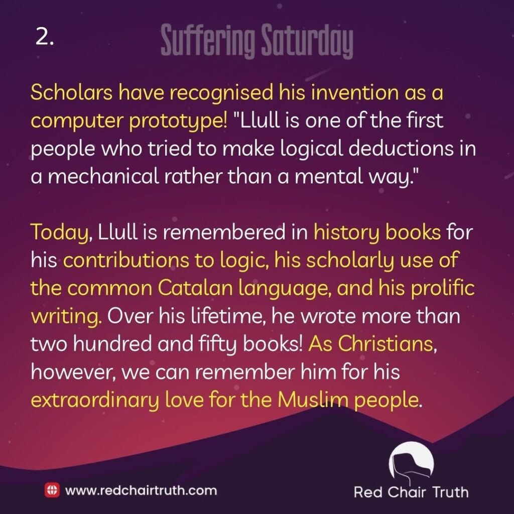 Today, Llull is remembered in history books for his contributions to logic, his scholarly use of the common Catalan language, and his prolific writing. Over his lifetime, he wrote more than two hundred and fifty books! As Christians, however, we can remember him for his extraordinary love for the Muslim people.