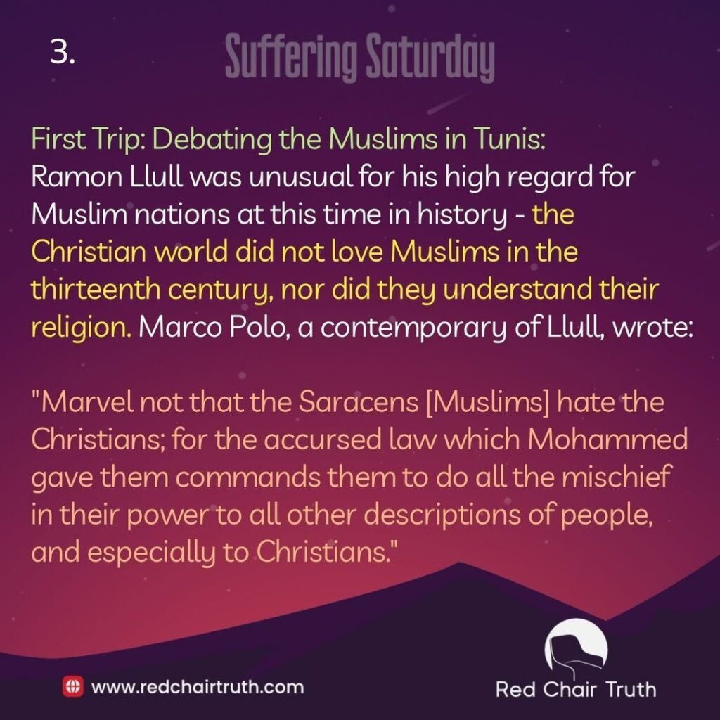 First Trip: Debating the Muslims in Tunis: Ramon Llull was unusual for his high regard for Muslim nations at this time in history—the Christian world did not love Muslims in the thirteenth century, nor did they understand their religion. Marco Polo, a contemporary of Llull, wrote: “Marvel not that the Saracens [Muslims] hate the Christians; for the accursed law which Mohammed gave them commands them to do all the mischief in their power to all other descriptions of people, and especially to Christians.”