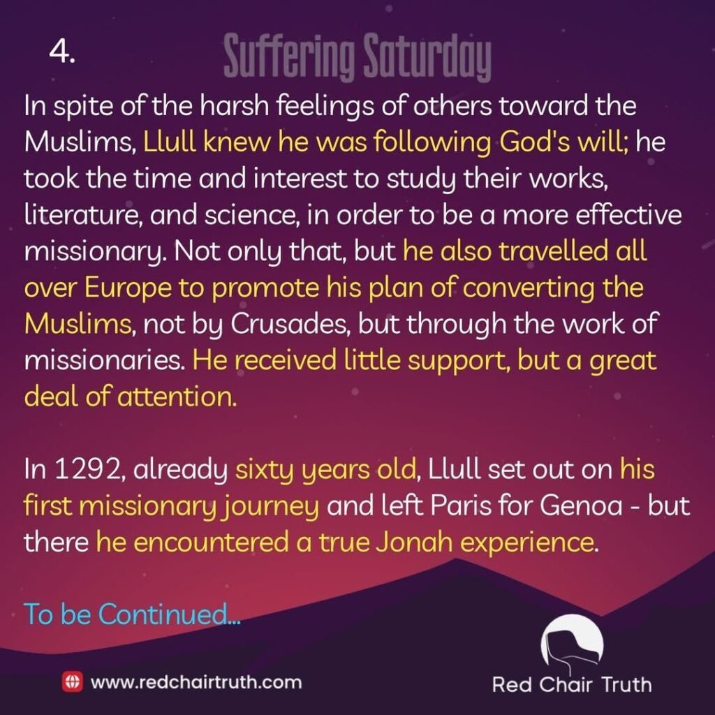 In spite of the harsh feelings of others toward the Muslims, Llull knew he was following God’s will; he took the time and interest to study their works, literature, and science, in order to be a more effective missionary. Not only that, but he also travelled all over Europe to promote his plan of converting the Muslims, not by Crusades, but through the work of missionaries. He received little support, but a great deal of attention. In 1292, already sixty years old, Llull set out on his first missionary journey and left Paris for Genoa—but there he encountered a true Jonah experience.