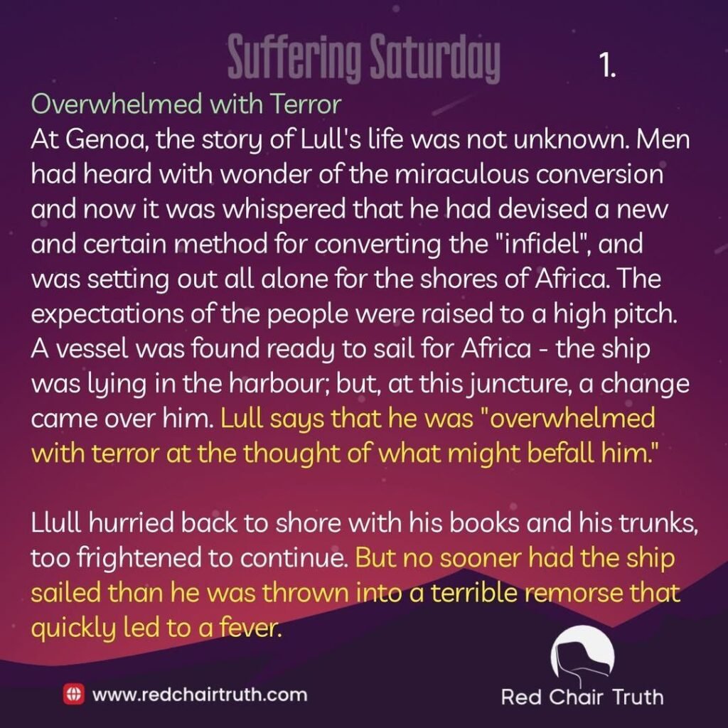 At Genoa, the story of Lull’s life was not unknown. Men had heard with wonder of the miraculous conversion and now it was whispered that he had devised a new and certain method for converting the “infidel,” and was setting out all alone for the shores of Africa. The expectations of the people were raised to a high pitch. A vessel was found ready to sail for Africa—the ship was lying in the harbour; but, at this juncture, a change came over him. Lull says that he was “overwhelmed with terror at the thought of what might befall him.”