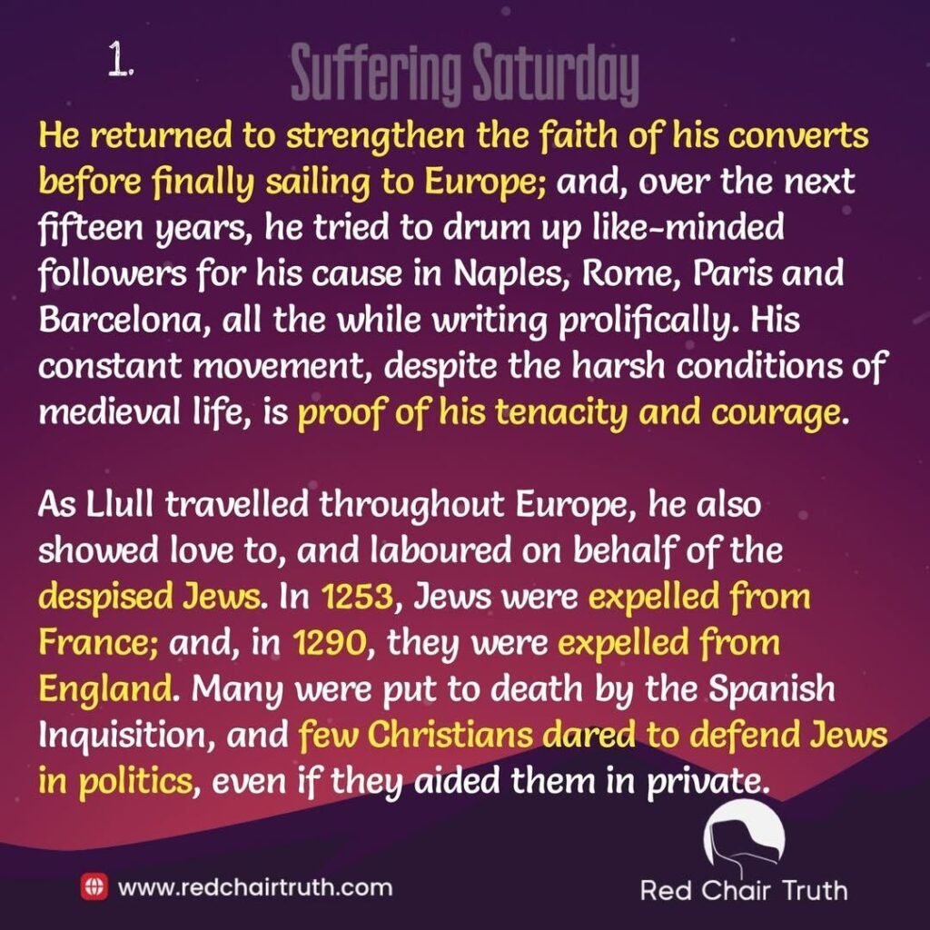 As Llull travelled throughout Europe, he also showed love to, and laboured on behalf of the despised Jews. In 1253, Jews were expelled from France; and, in 1290, they were expelled from England. Many were put to death by the Spanish Inquisition, and few Christians dared to defend Jews in politics, even if they aided them in private. This despised race, however, was not outside the circle of Llull’s love and interest. He wrote many books to prove to them that their expected Messiah was none other than the Jesus of Nazareth. His great mission to the Saracens [Muslims] in Africa did not blind him to the needs of missions at home.