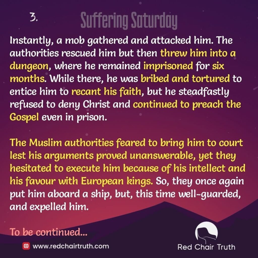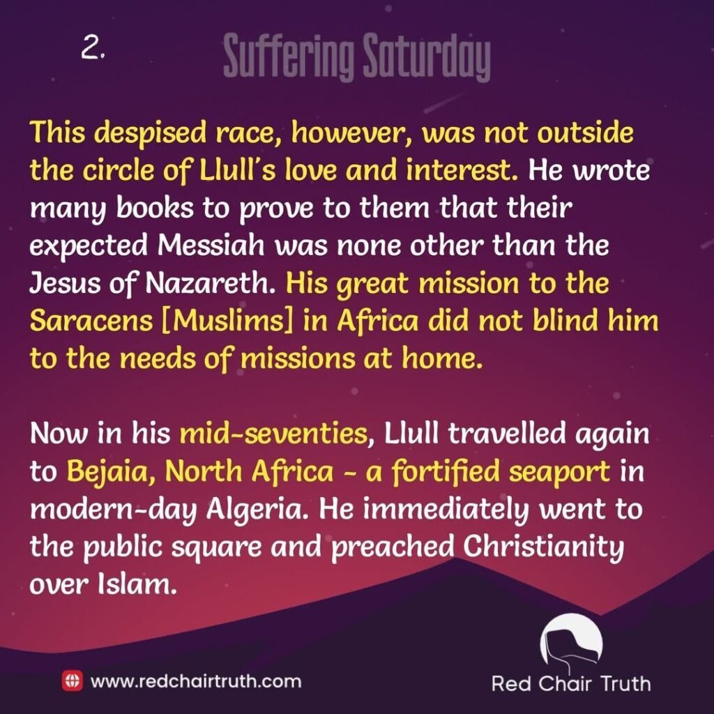 Now in his mid-seventies, Llull travelled again to Bejaia, North Africa—a fortified seaport in modern-day Algeria. He immediately went to the public square and preached Christianity over Islam. Instantly, a mob gathered and attacked him. The authorities rescued him but then threw him into a dungeon, where he remained imprisoned for six months. While there, he was bribed and tortured to entice him to recant his faith, but he steadfastly refused to deny Christ and continued to preach the Gospel even in prison. The Muslim authorities feared to bring him to court lest his arguments proved unanswerable, yet they hesitated to execute him because of his intellect and his favour with European kings. So, they once again put him aboard a ship, but, this time well-guarded, and expelled him.