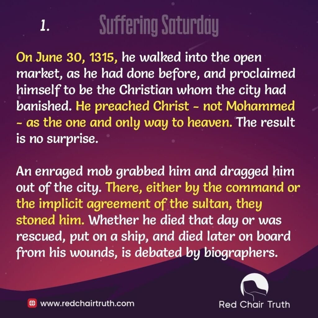On June 30, 1315, he walked into the open market, as he had done before, and proclaimed himself to be the Christian whom the city had banished. He preached Christ—not Mohammed—as the one and only way to heaven. The result is no surprise.