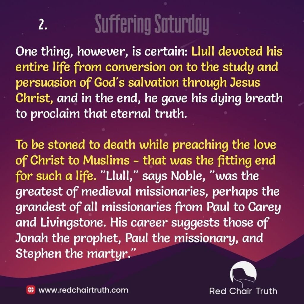 One thing, however, is certain: Llull devoted his entire life from conversion on to the study and persuasion of God’s salvation through Jesus Christ, and in the end, he gave his dying breath to proclaim that eternal truth. To be stoned to death while preaching the love of Christ to Muslims—that was the fitting end for such a life. “Llull,” says Noble, “was the greatest of medieval missionaries, perhaps the grandest of all missionaries from Paul to Carey and Livingstone. His career suggests those of Jonah the prophet, Paul the missionary, and Stephen the martyr.”