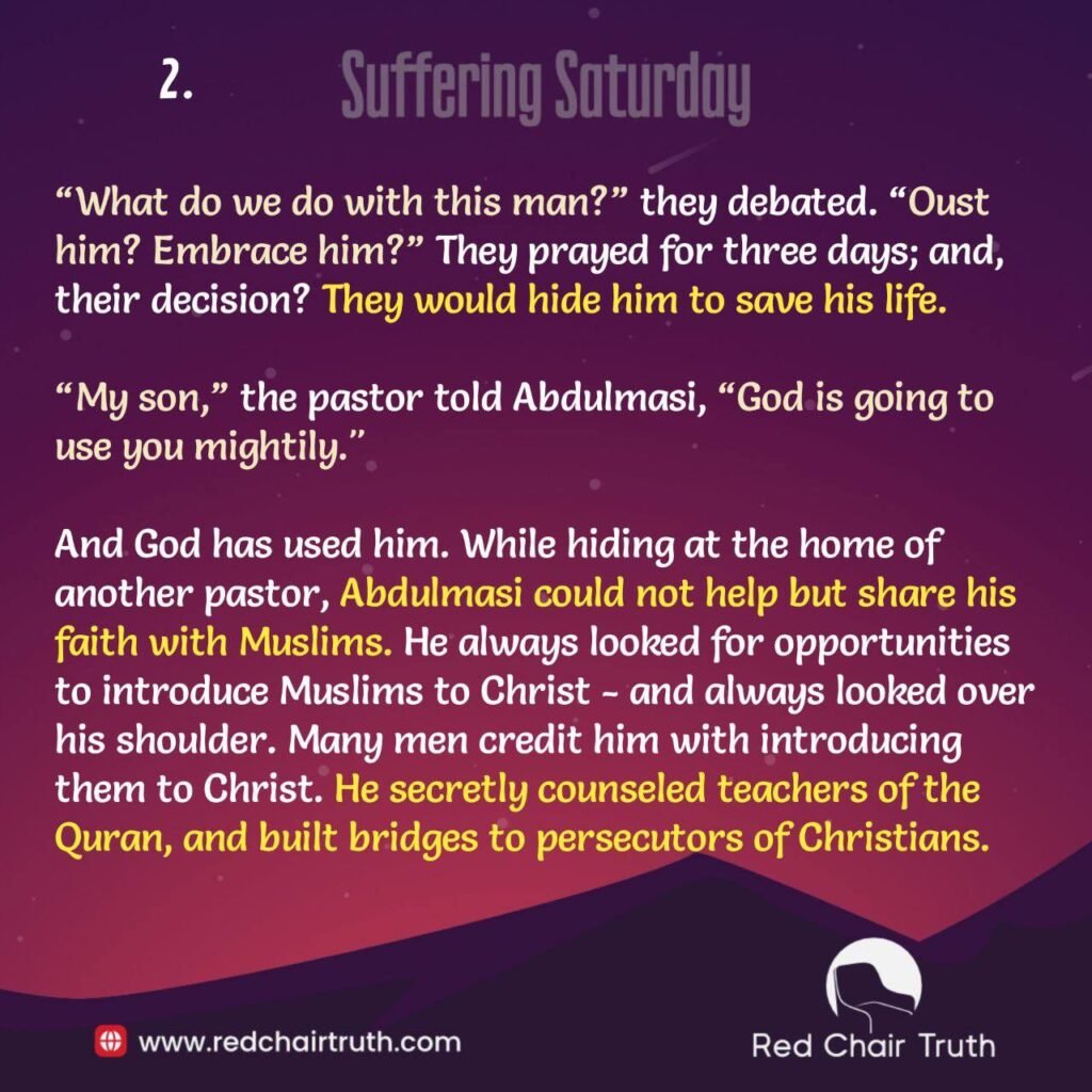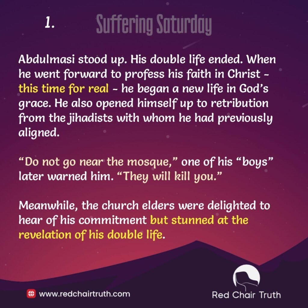 Abdulmasi stood up. His double life ended. When he went forward to profess his faith in Christ this time for real – he began a new life in God’s grace. He also opened himself up to retribution from the jihadists with whom he had previously aligned. – “Do not go near the mosque, one of his “boys” later warned him. “They will kill you.” Meanwhile, the church elders were delighted to hear of his commitment but stunned at the revelation of his double life.