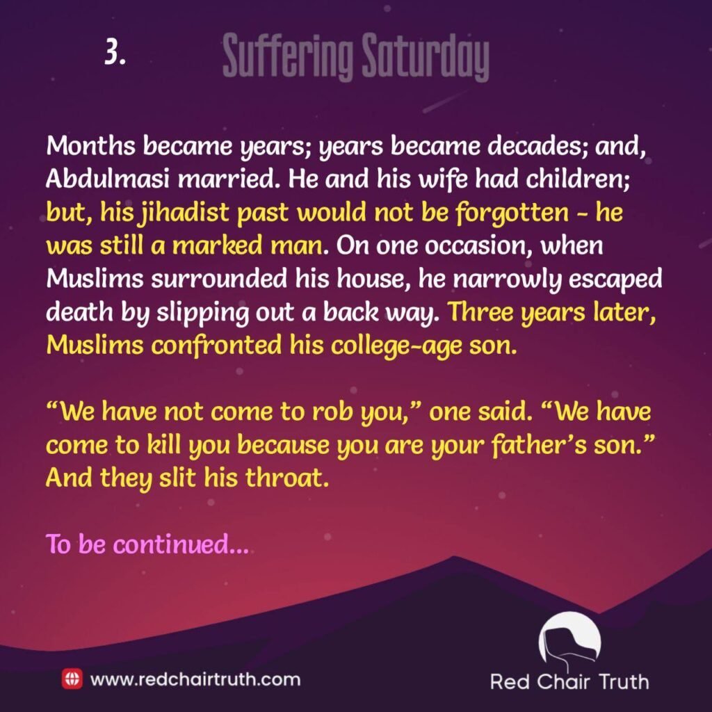 Months became years; years became decades; and, Abdulmasi married. He and his wife had children; but, his jihadist past would not be forgotten – he was still a marked man. On one occasion, when Muslims surrounded his house, he narrowly escaped death by slipping out a back way. Three years later, Muslims confronted his college-age son. “We have not come to rob you,” one said. “We have come to kill you because you are your father’s son.” And they slit his throat.