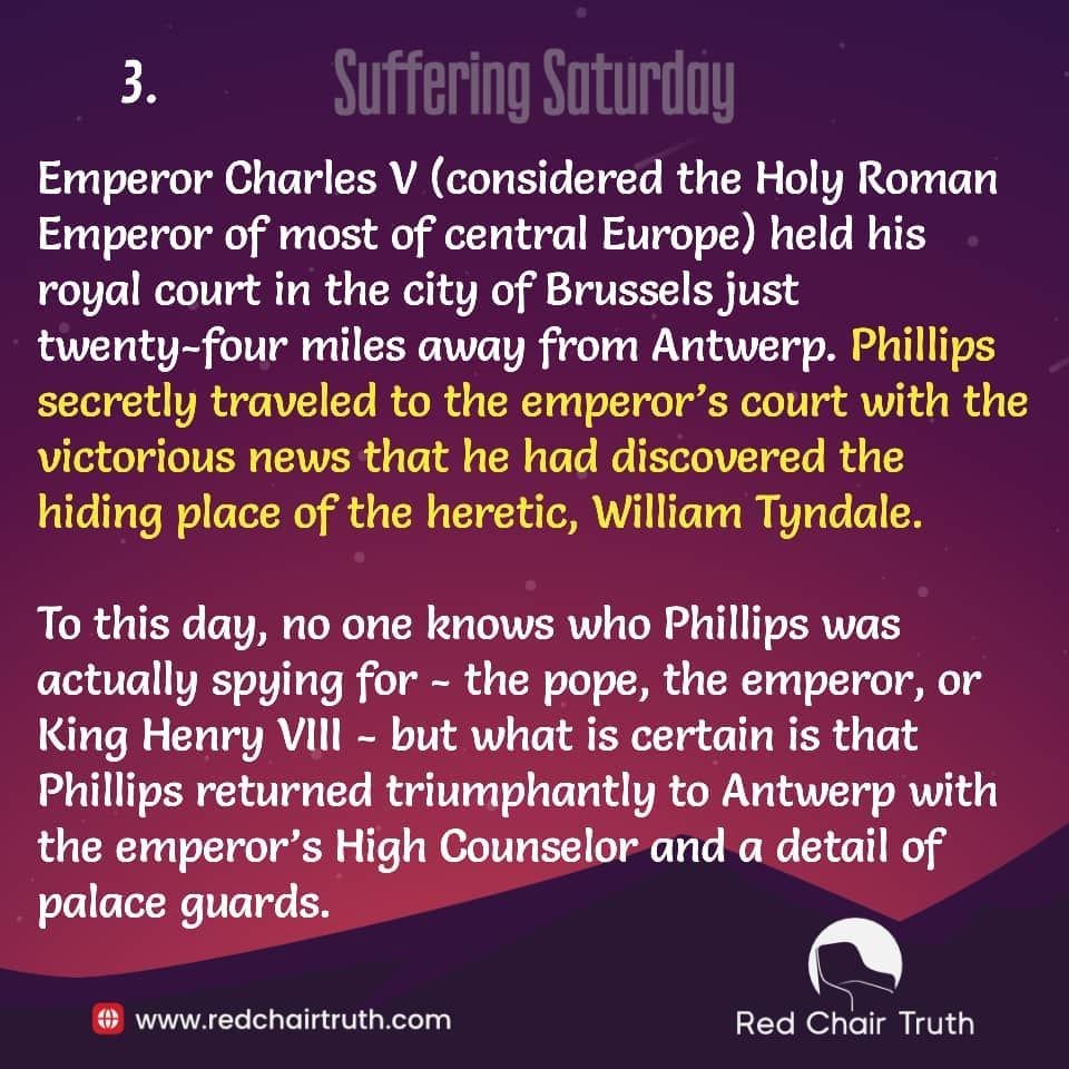 Occasionally, Tyndale left his lodgings for a quiet dinner with Pointz and fellow merchants of the city. One evening, a man named Henry Phillips joined their group and appeared to share Tyndale’s excitement for the Word of God; and, within days, Tyndale had taken Phillips into his confidence, showing him his current work on the Old Testament and his commentaries on salvation in Christ. Pointz was suspicious of the quickly formed friendship and questioned Phillips closely on his next visit. Still uneasy, Pointz left Antwerp for a month-long business trip. Emperor Charles V (considered the Holy Roman Emperor of most of central Europe) held his royal court in the city of Brussels just twenty-four miles away from Antwerp. Phillips secretly traveled to the emperor’s court with the victorious news that he had discovered the hiding place of the heretic, William Tyndale. To this day, no one knows who Phillips was actually spying for – the pope, the emperor, or King Henry VIII – but what is certain is that Phillips returned triumphantly to Antwerp with the emperor’s High Counselor and a detail of the palace guards.