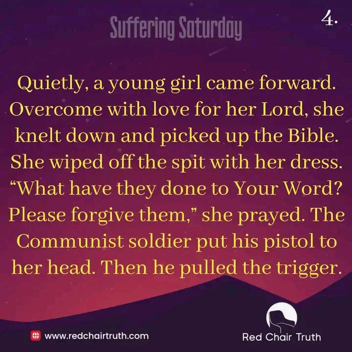 Quietly, a young girl came forward. Overcome with love for her Lord, she knelt down and picked up the Bible. She wiped off the spit with her dress. “What have they done to Your Word? Please forgive them,” she prayed. The Communist soldier put his pistol to her head. Then he pulled the trigger.