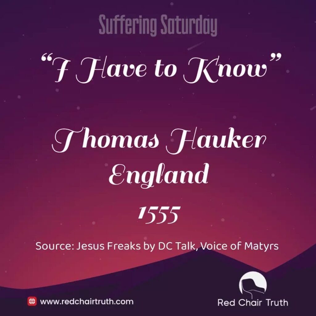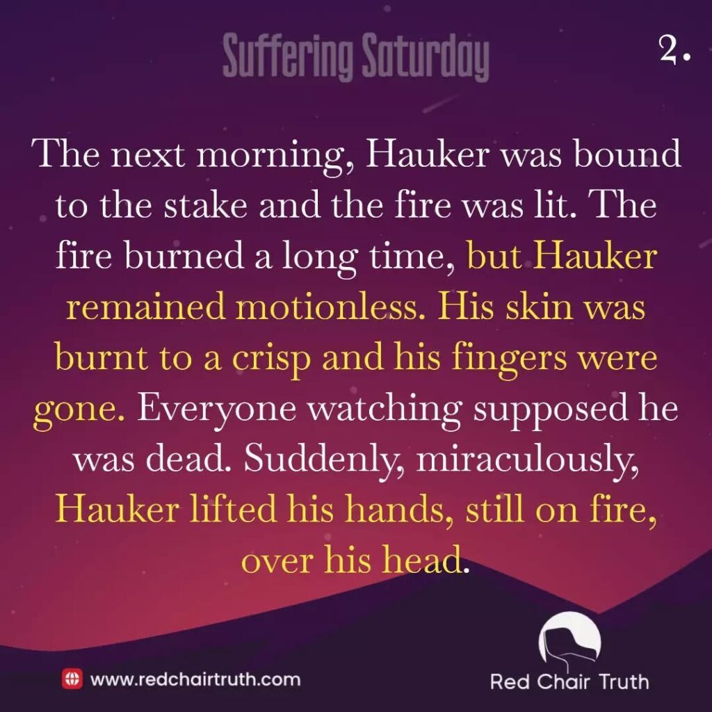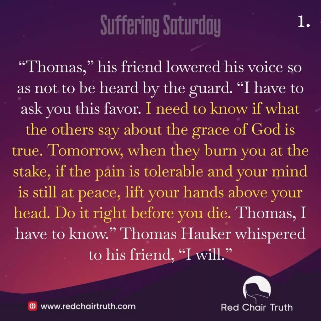 “Thomas,” his friend lowered his voice so as not to be heard by the guard. “I have to ask you this favor. I need to know if what the others say about the grace of God is true. Tomorrow, when they burn you at the stake, if the pain is tolerable and your mind is still at peace, lift your hands above your head. Do it right before you die. Thomas, I have to know.” Thomas Hauker whispered to his friend, “I will.” The next morning, Hauker was bound to the stake and the fire was lit. The fire burned a long time, but Hauker remained motionless. His skin was burnt to a crisp and his fingers were gone. Everyone watching supposed he was dead.
