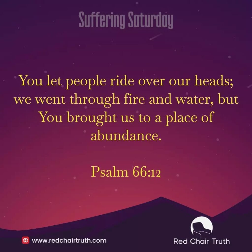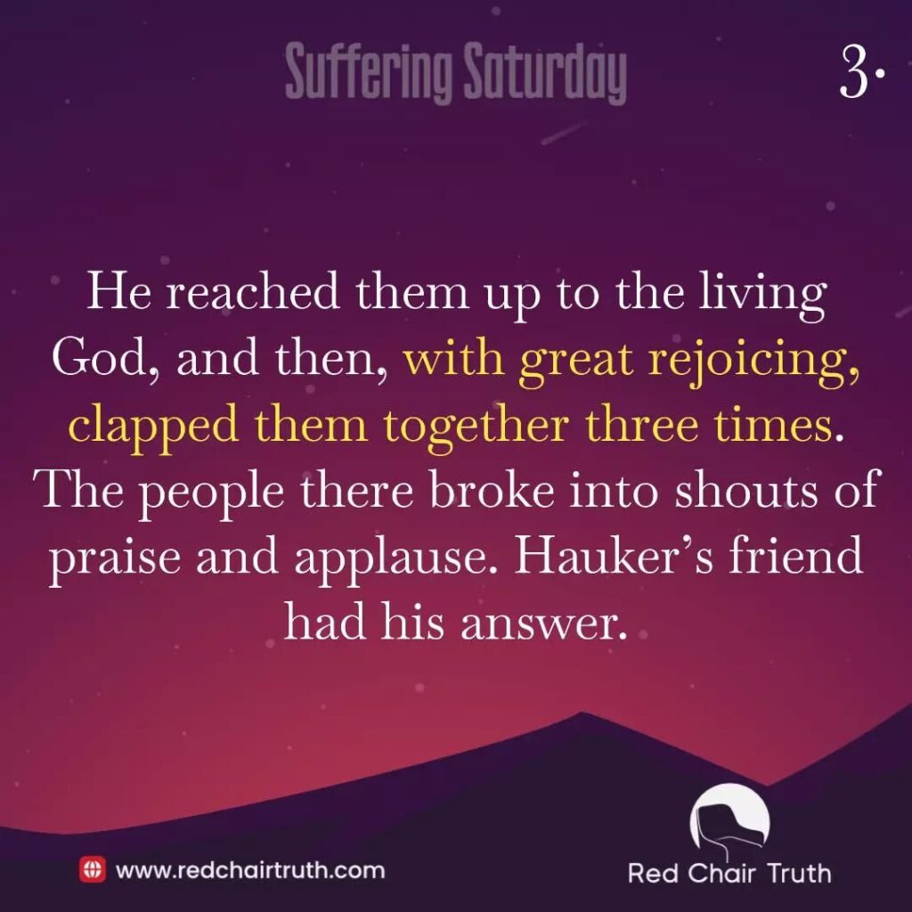 Suddenly, miraculously, Hauker lifted his hands, still on fire, over his head. He reached them up to the living God, and then, with great rejoicing, clapped them together three times. The people there broke into shouts of praise and applause. Hauker’s friend had his answer. You let people ride over our heads; we went through fire and water, but You brought us to a place of abundance. Psalm 66:12.